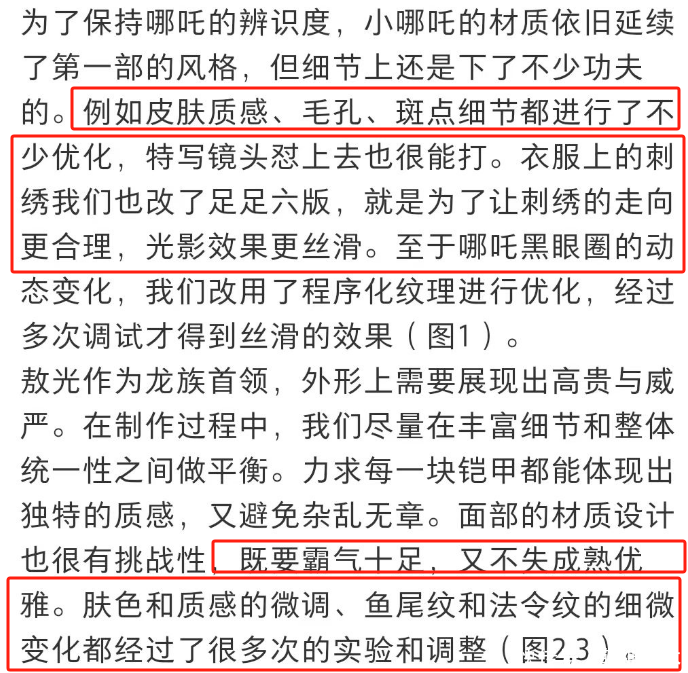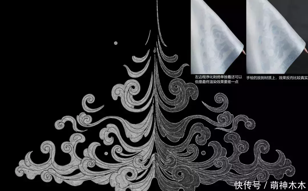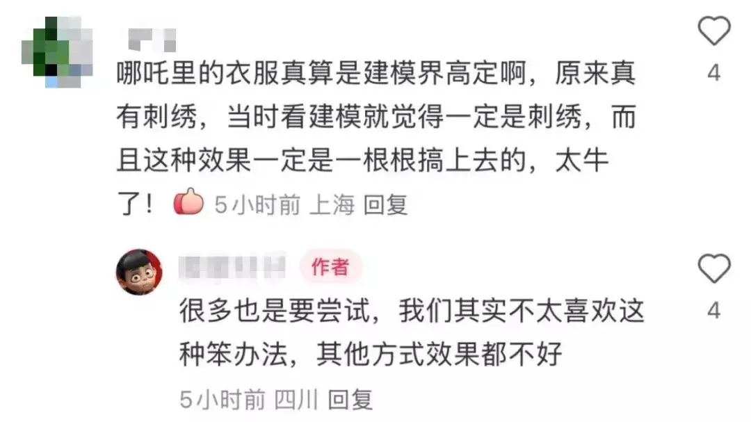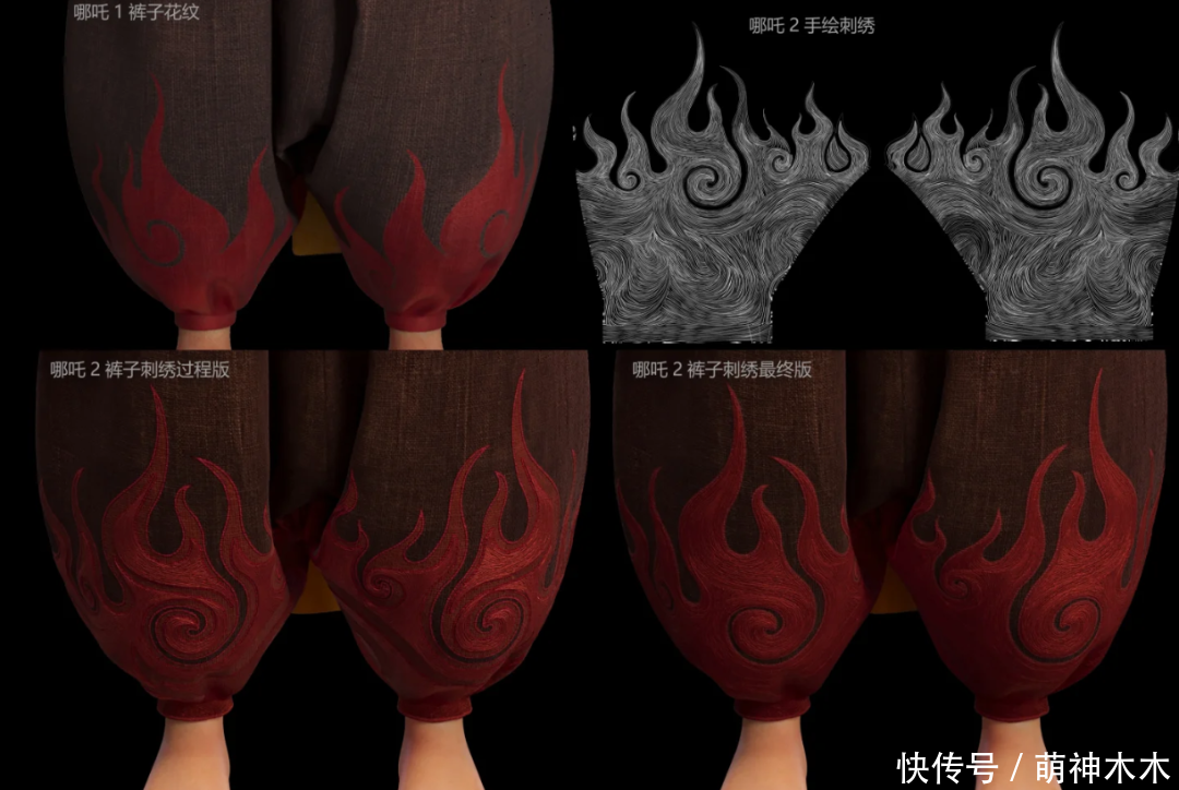 不仅如此,包含在哪吒的虚拟人物衣服上的刺绣都是一笔一笔画上去的,每一根都是手绘上去的,而且为了让刺绣图案的走向更合理,后续还更改了六版。