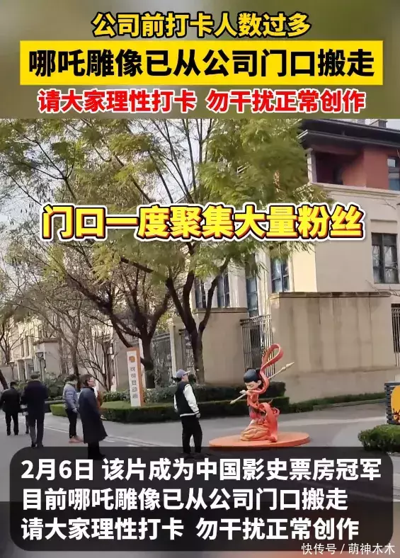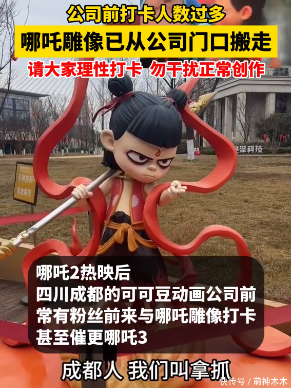 好在精益求精地付出让吒儿终于扬眉吐气,其动画制作公司——可可豆动画公司成为了众多粉丝的打卡点,有人激动到半夜想要进门打卡,催更催到了家门口了,而原本安置在公司门口的巨型哪吒雕像也被转移到了园区的广场上。